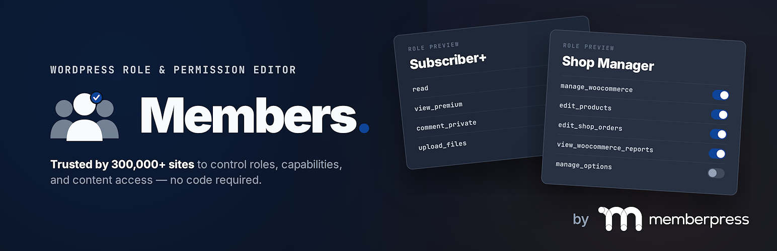 Members allows you to set permissions to restrict content on your site by providing a simple user interface (UI) for WordPress’ powerful roles and capabilities system, which has traditionally only been available to developers who know how to code this by hand.